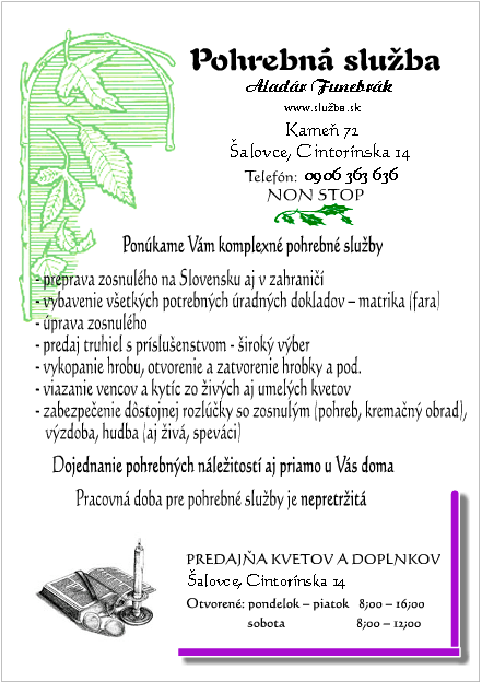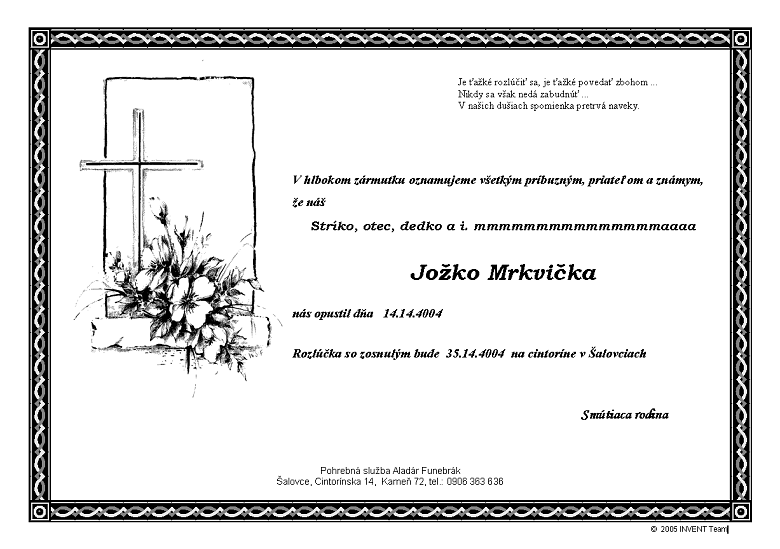 K tvorbe prvého webu „Pohrebná služba“ (stránky sú už zrušené – len vzorová ukážka v pôvodnej podobe bez úprav kódu, zmenené len nacionálie) ma inšpiroval môj „skoro príbuzný“ – majiteľ pohrebníctva, keď mu jeho kamarát sprostredkoval registráciu výhodnej adresy, ale sľub vytvoriť stránky dlho neplnil (rok 2006). Postup tvorby a môj začiatočnícky vývoj je popísaný v odpovedi kamarátovi („Blog“). Súčasťou tejto „zákazky“ bola aj tvorba firemných materiálov – logo, hlavičkové papiere a obálky, vizitky, reklamný letáčik, niekoľko vzorov parte a poďakovaní, vyhľadanie vhodných citátov a pod.
